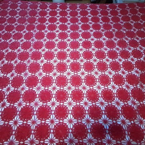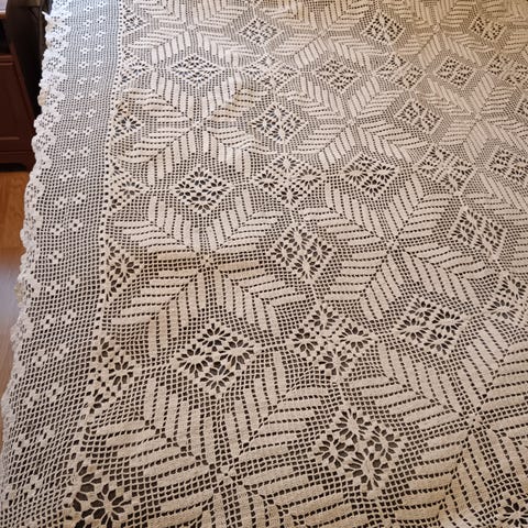 Kalalangasta virkattu lasten päiväpeitto tai pöytäliina. Koko n. 105 x 210 cm. Ei moitteita kunnossa.
