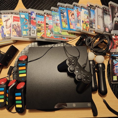 Playstation 3 konsoli + 2 ohjainta, SingStar mikit ja 10 peliä.