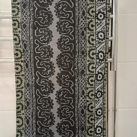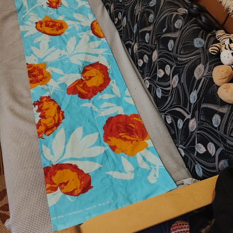 Tavattoman kaunis Marimekon kaitaliina. Tehdasvalmisteinen. En tiedä suunnittelijaa. Kuvassa ryppyinen, luonnollisestikin aivan toisen näköinen silitettynä.