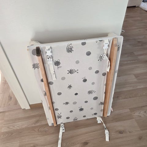 Hoitotaso+muovinen patja jossa puhallettavat reunat. Mukaan saa halutessaan valkoisen unipesän.