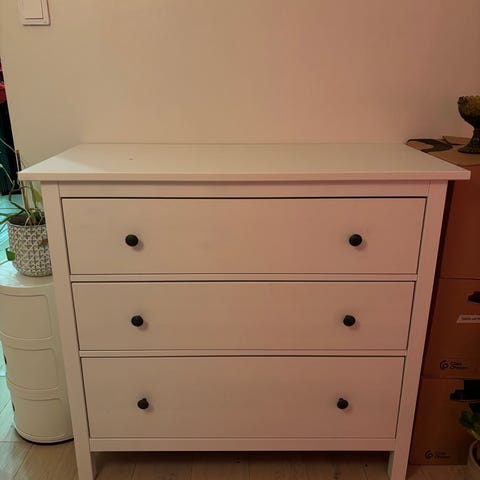 Kuvan mukainen lipasto, ollut todella vähällä käytöllä. Kunto hyvä. Muutama ihan pieni naarmu oikea reuna ja yhden laatikon alaosa, mistä kuvat. Lisäksi päälitasossa pieni lommo mistä pintamateriaali kulunut, sijaitsee vasen takakulma, tästä myös kuvat. Ikeassa myynnissä uusi 119e.