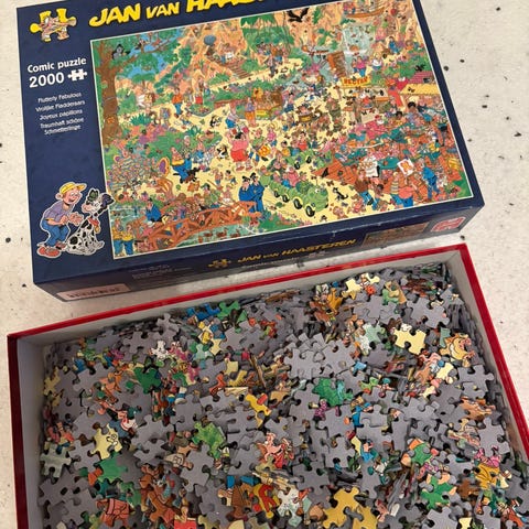 Kerran kasattu Jan Van Haasteren palapeli, 1000 palaa. Kaikki palat tallessa ja hyvässä kunnossa. Mukana palapeli”posteri”. Myynnissä myös muualla.