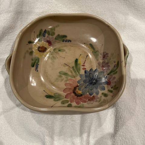 Tästä pieni n 19cm x 19cm kokoinen kaunis kukkavati, vaikka makeisille, hedelmille tai kynttilälle. Ehjä. Mahdollisesti Laila Zinkin maalaama, mutta signeerausta en löytänyt. Massaleimat. Nouto, posti tai toridiili.