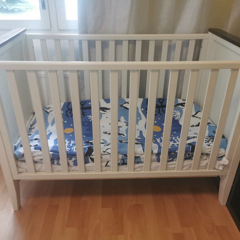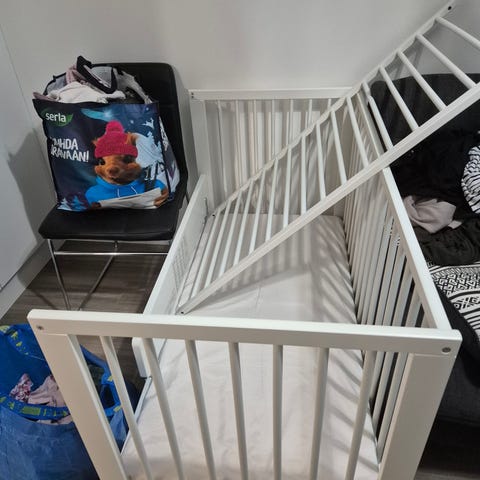 For sale: High-quality baby cot and spring&foam matress. Both made in EU and in very good condition, odourless and spotless. Can be used as toddler bed by changing the side (like in the last photo by the seller). Only pick-up from Myyrmäki, Vantaa.