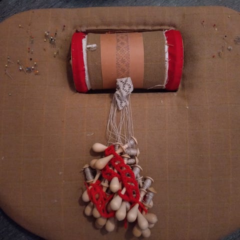 100 nypykkää ja puolaus laite niille. Kaksi 18cm rullaa joiden halkaisija 10cm. Nypläystyyny 60×40cm. Mukaan kankainen kantokassi jossa kulkee kaikki tavarat kätevästi mukana.