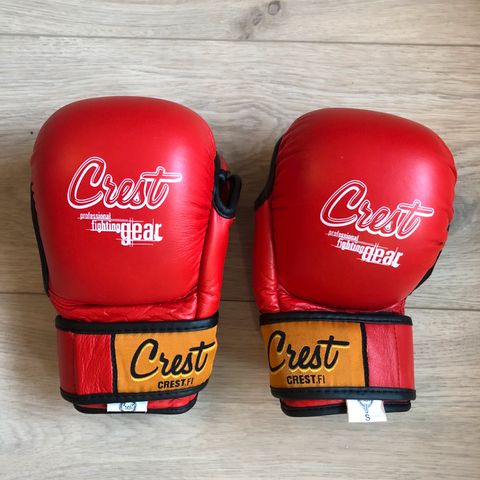 Crest Kamppailuhanskat on valmistettu nahasta ja ovat mustan väriset. Koko L, unisex-malli. Soveltuvat kamppailulajeihin.