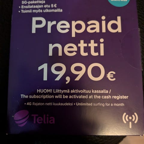 Aloituspakkauksen hinta 24,90 €. Aloituspaketissa 30 vrk rajaton netti kotimaassa (DNA Dataprepaid ei toimi ulkomailla). Netin maksiminopeus jopa 400 Mbit/s.