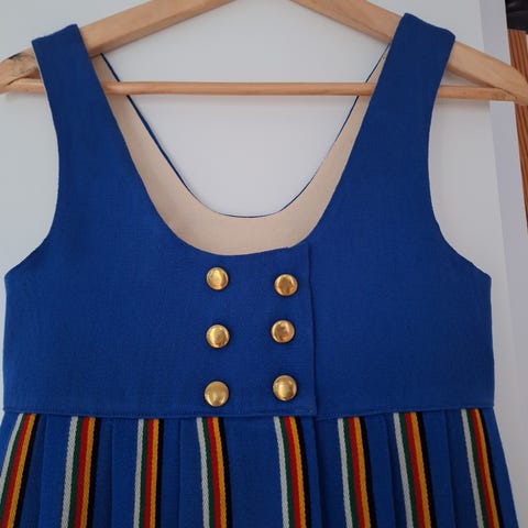 Lasten/tyttöjen Hämeen kansallispuku, koko mittojen perusteella noin 104. Esim. liivin kainalo-kainalo mitta noin 31 cm ja paidan hihan olkasauma-hihansuu noin 38 cm.
