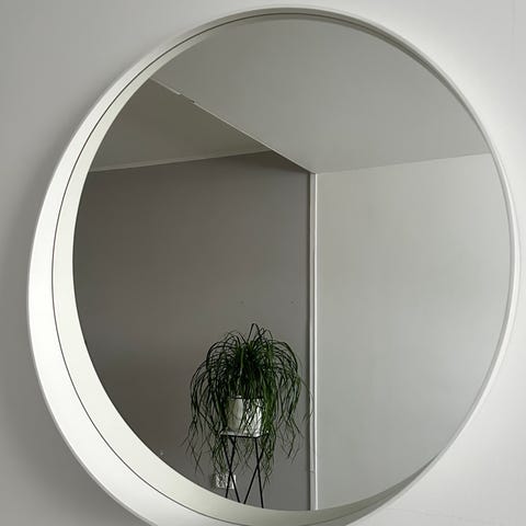 IKEA pyöreä peili sinisellä kehyksellä. Peilin muoto on pyöreä, ja kehys on sininen. Sopii seinälle kiinnitettäväksi esimerkiksi makuuhuoneeseen tai muuhun tilaan.