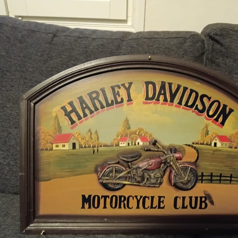 Harley-Davidson moottoripyörämerkki, jossa on LED-valaistus. Merkki on valmistettu materiaaleista, jotka soveltuvat sisätilojen koristekäyttöön. Värit ovat oranssi, musta ja valkoinen. Tuotteessa on kiinnityspiste ja johdon reikä valaistuksen liittämistä varten.