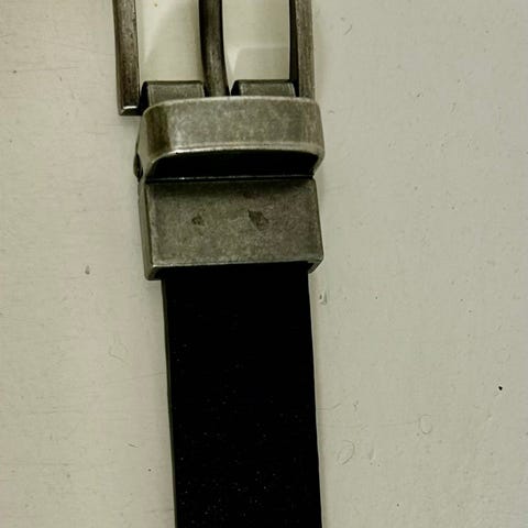 Unisex musta nahkavyö, jossa on metallin värinen solki ja neljä reikää. Pituus 78 cm. Leveys 3 cm.