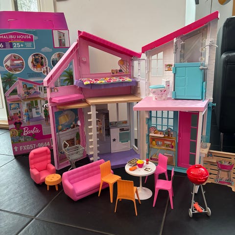 Ostetaan hyväkuntoinen kokoontaitettava Barbie Malibu talo. Mielellään kaikki osat tallessa (ks. kuva). Alkuperäistä pahvipakkausta en kaipaa.