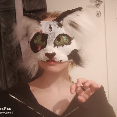 Vihreä Kissanaamio/alienkissa/cosplay/therian maski, itse tehty, eikä sitä ole käytetty kertaakaan. Nouto pikku-huopalahdesta. Mukaan saa ilmaisia therian-symbooli tarroja 2kpl.