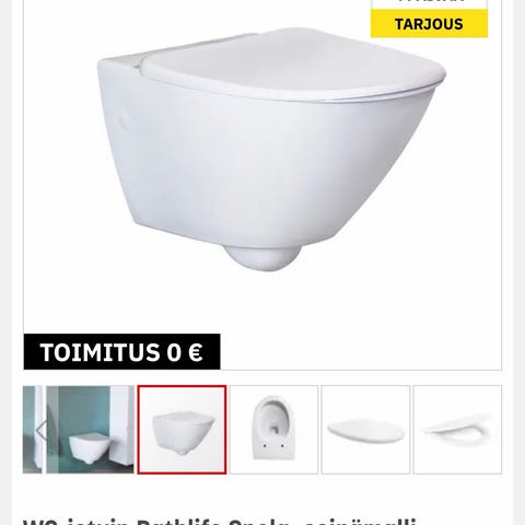 Hyväkuntoiset wc-istuin Arabia, pesuallas Arabia 57x42 hajulukkoineen, kaksi erillistä kaappia, joista toisessa peiliovi, yhden koko 45(L)x56(K)x18,5(S), loisteputkivalaisin 80. WC-istuimen kansi ja hana suihkuineen ei kuulu pakettiin. Myydään vain kaikki yhdessä. Noudettavissa 13.-16.1.