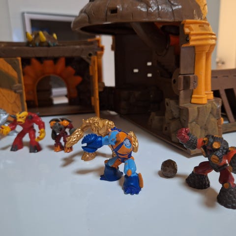 Gormiti Island-leikkisetti, kuvan mukainen kokonaisuus eli saari ja 4 figuuria (ei kuitenkaan sisällä saaren mukana tullutta kultaista figuuria vaan nämä on ostettu erikseen). Itse saari osineen on hyväkuntoinen. Säilytyslaatikon läppä repeytynyt ja laatikko itsessään hieman kulunut.