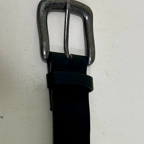Unisex musta nahkavyö, pituus 75 cm. Kuuden tehdasreiän lisäksi päähän on tehty kaksi itsetehtyä reikää. Takapuoli ruskea.