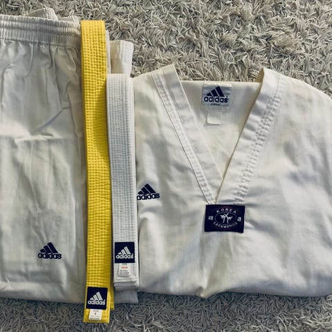 Taekwondo-puku. Uusi, käyttämätön. Varustettu vyöllä ja valmistettu kamppailulajien harjoitteluun soveltuvasta materiaalista.