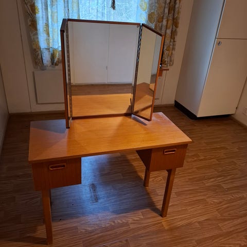 Ruskea meikkipöytä.