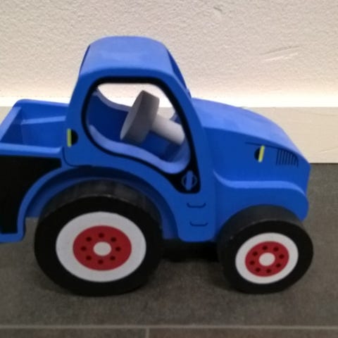 Lasten ajoneuvo sininen muovista valmistettu, jossa vihreä ohjauspyörä ja takaosa. Ajoneuvo soveltuu lapsille leikkikäyttöön.