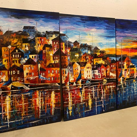 Taiteilija Tello Anttilan maalaama Kukko-triptyyki (öljy ja hiili kankaalla)