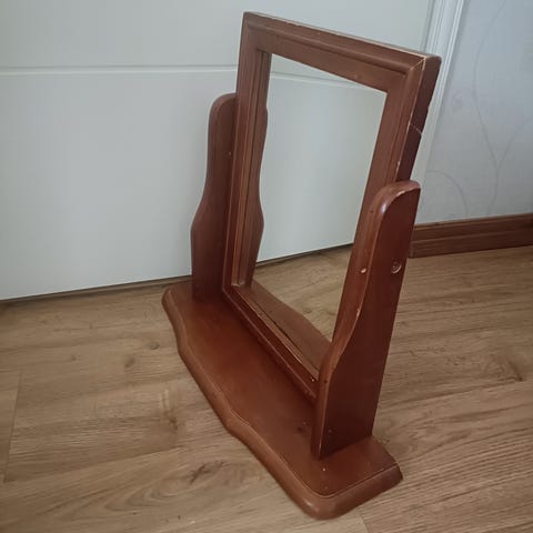 Pyöreä seinäpeili, jossa on leveä puukehys. Peilin halkaisija on noin 80 cm. Sopii seinälle ripustettavaksi ja sisustuselementiksi erilaisiin tiloihin.