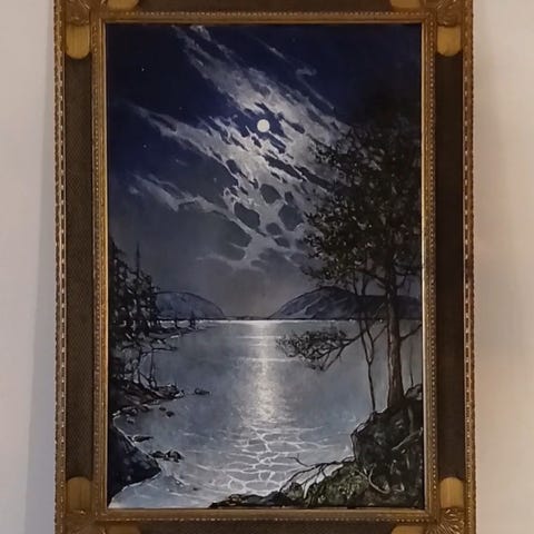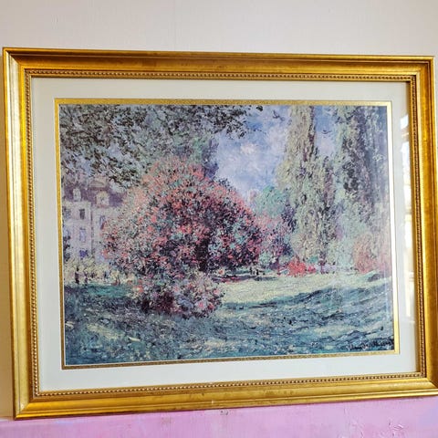 Kehystetty maalaus, jossa näkyy maisema ja ihmishahmoja. Maalaus on perinteisessä kehyksessä, joka on kullanvärinen. Kuvassa on maisemallinen näkymä, jossa on rakennuksia ja ihmisiä.