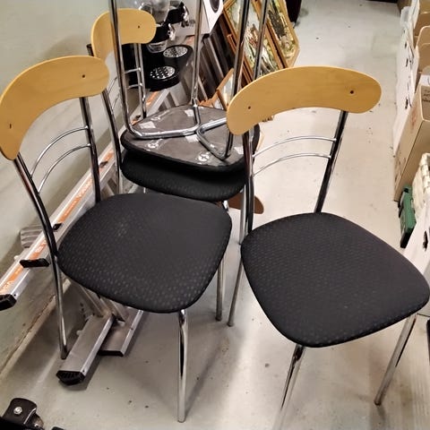 Ruskeat puiset tuolit, jossa metalliset jalat. Istuinosat siistissä käytetyssä kunnossa. Yhden tuolin jalkojen kiinnityksessä korjattavaa, muille riittää kiristäminen. Vain settinä ja vain nouto.