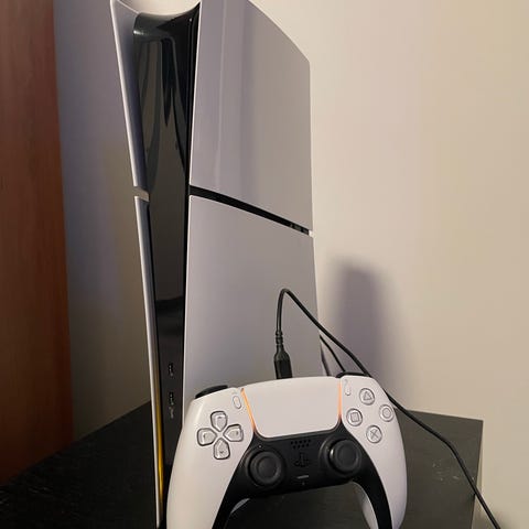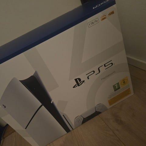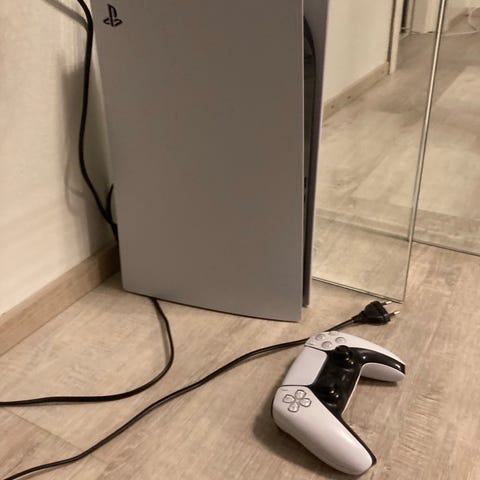 Sony Playstation 5 pelikonsoli, jossa mukana ohjain. Laite on suunniteltu nykyaikaiseen pelaamiseen ja tukee uusimpia pelejä ja ominaisuuksia.