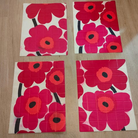 Itsetehdyt tabletit Marimekon Korento -kankaasta, pellavaa, 4 kpl 32 cm x 44 cm. 4 kpl pakettina 10 e. Koiratalous.