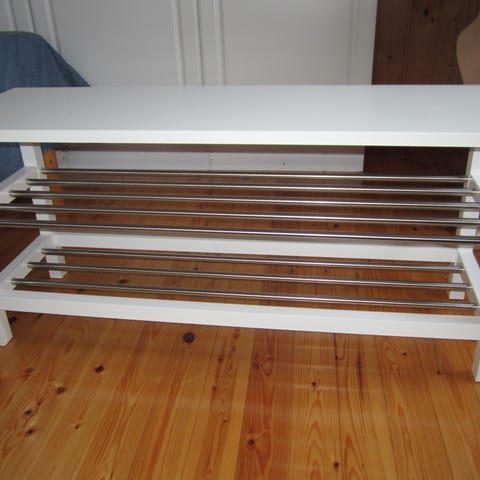 Hyväkuntoinen ja tukeva valkoinen penkki, kahden tason säilytys kengille. Kenkätasot metallia.