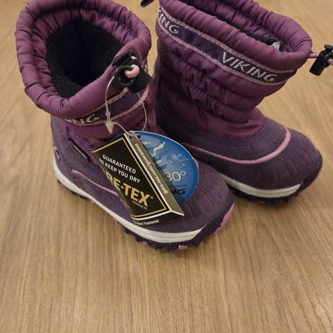 Viking lasten talvikengät, koko 21, suunniteltu tytöille. Kengät ovat väriltään violetti ja niissä on tarrakiinnitys. Sopivat lasten talvikäyttöön tarjoamaan suojaa ja mukavuutta kylmissä olosuhteissa. pituus 14 ja leveys 6cm. Goretex olleet kerran rattaissa.