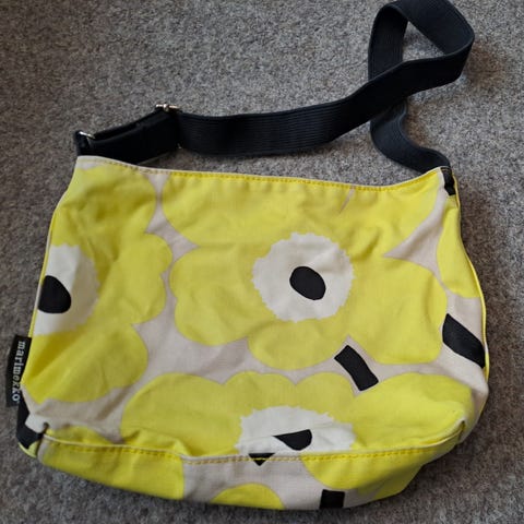 Marimekko kangas olkalaukku, keltainen väri, unisex-malli. Laukussa säädettävä olkahihna ja useita taskuja, sopii pienten esineiden kantamiseen.