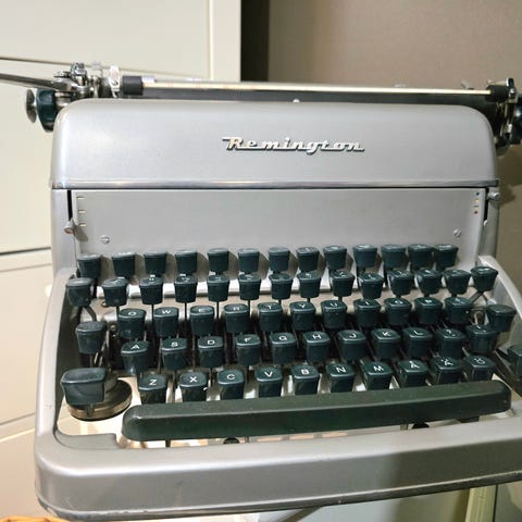 Kirjoituskone 50 luvulta. Koko: leveys 36 cm, syvyys 33 cm ja korkeus 13 cm.