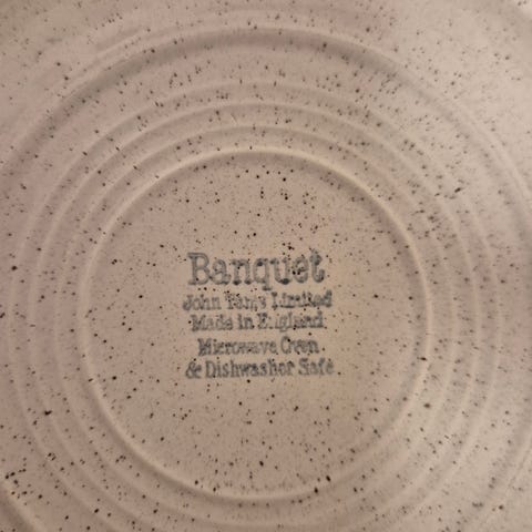 Englannissa 80-luvulla tehdyt keramiikkalautaset, ilmeisesti Confetti-nimistä sarjaa, pohjan tekstit googlattuna merkki lienee John Tams Banquet. Setissä 6x syvä ja 6x matala lautanen. Syvän halkaisija 21 cm, matalan n. 24 cm. Hyväkuntoiset vintage-kuntoiset. Myyn mielellään kaikki settinä, 40e kaikki lautaset.