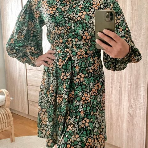 Kauniin mallinen mekko, jossa pääosin vihreäsävyinen kukkakuosi. Alaspäin levenevä helma, vyötäröllä leveä vyö, jossa koristetikkaukset. Edessä ja hihansuissa kangaspäällysteiset napit, pussihihat. Pituus olalta 92 cm. Kangas hyvin laskeutuvaa satiinia.