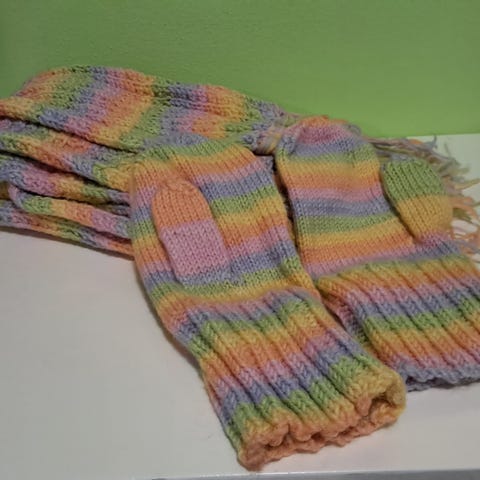 Kaksiväriset käyttämättömät lapaset Novelle-langasta. Koko vastaa käsinekokoa 8. Lapsen leveys 10 cm. Väri on tummanpunainen ja keltainen.