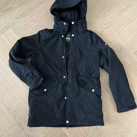 Hyväkuntoinen takki. Huppu puuttuu. Väri harmaa / musta.