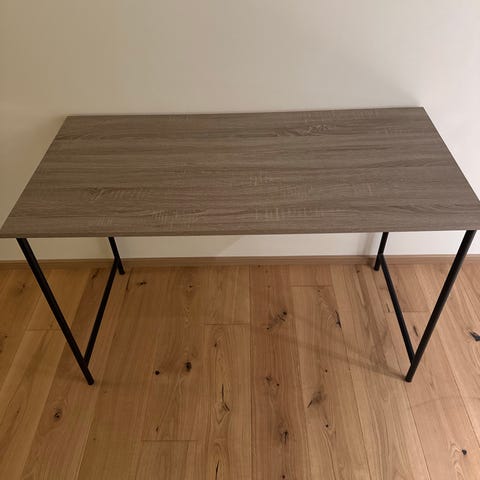 Valkoinen pöytätaso ja harmaat metalliset jalat.