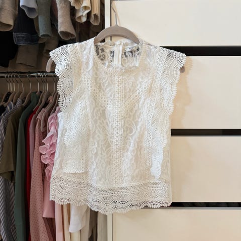 Grace & Mila -merkkinen luonnonvalkoinen puhvihihainen pitsipaita puuvillasekoitetta.