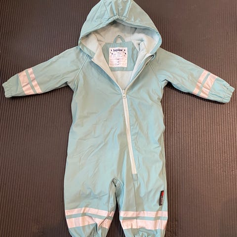 Lupilu turkoosinvihreä vauvan kurahaalari fleecevuorella koossa 74/80 (pientä kokoa). Ehjä ja hyvässä kunnossa. Käytetty muutamia kertoja vauvalla rattaissa ollessa.