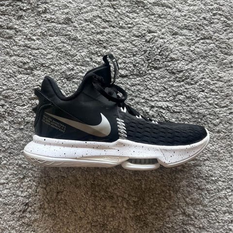 Nike LeBron Witness 5 koripallokengät, koko 40.5. Mustavalkoiset koripallokengät, jotka on suunniteltu tarjoamaan tukea ja mukavuutta koripallopelaamiseen.