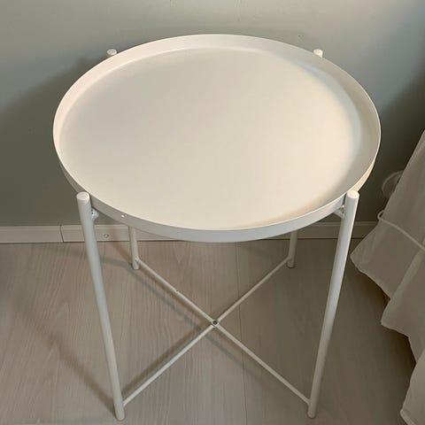 Ikean gladom tarjotinpöytä, valkoinen 45x53cm. Kuin uusi. Ainoa ”virhe” on tuo tarranpoistoyrityksestä jäänyt liima. Ei käytönjälkiä. Nouto. Saa tarjota hintaa.