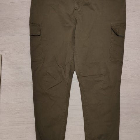 Khakinvihreät housut, kokoa M mutta kapeat lahkeet. 90% nylon, 10% spandex.