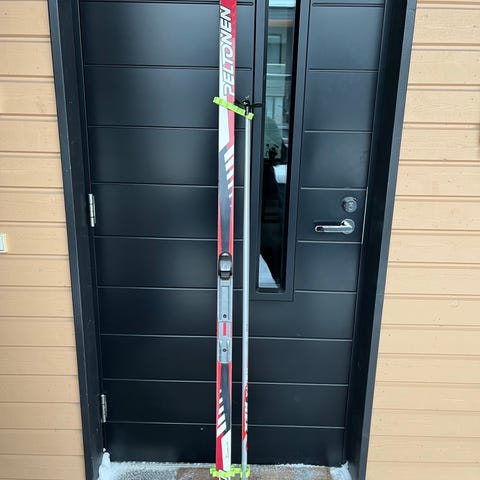 Peltosen sukset ja Nova sauvat, sopii ainakin 169cm ja 63kg hiihtäjälle.