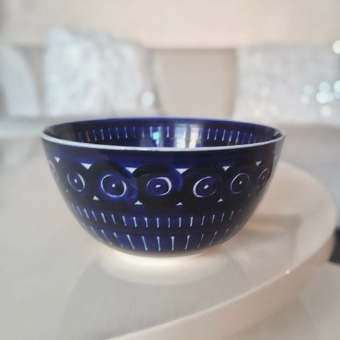 Hyvin vähällä käytöllä ollut Valencia keittokulho. Halkaisija 18, korvien kanssa 23 cm. Suunnittelija Ulla Procope, signeerattu.
