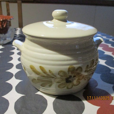 Kaunis Granit kannu, valkoinen väri ja punaiset kukkakuvioinnit.