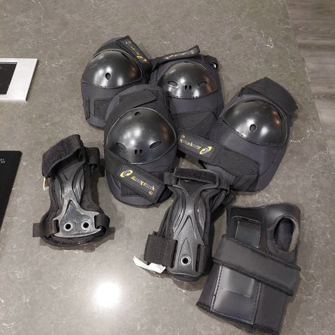 Avaamaton paketti sis. polvi-, kyynär- ja rannesuojat. Koko L.