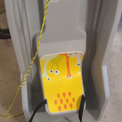 Sininen lasten pulkka, jossa on turvavyö. Sopii lasten kuljetukseen lumisissa olosuhteissa.