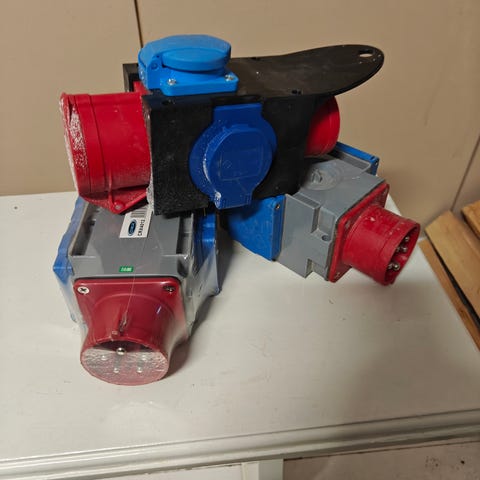 Vähäisellä käytöllä ollut siisti adapteri voimavirralle. Sisään adapteriin tulee 32 A ja ulos 16 A, välissä 3 jousisulaketta.