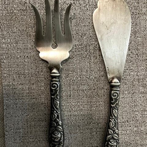 Aterinsarja, joka sisältää haarukan, veitsen ja ison lusikan. Lusikka alpakkaa Haarukan ja veitsen merkinnöistä en saa selvää.